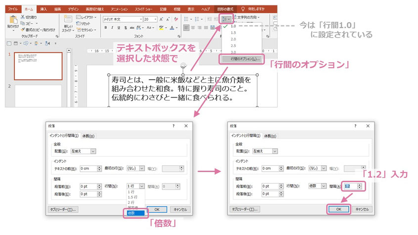 「行間」というプルダウンで「倍数」をクリック。その右の「間隔」を「1.2」か「1.5」と打ち込んでみましょう。「OK」をクリック。